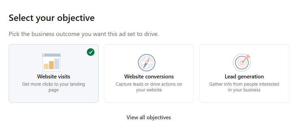 Recommendation: Choose the objective according to your main goal. For example, select “Website Visits” if you want people to visit your site.